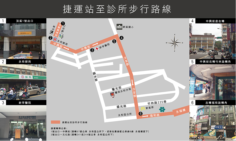 搭乘捷運橘線至頂溪站,於1號出口轉57號公車,在永和區公所站下車步行3分鐘可到診所