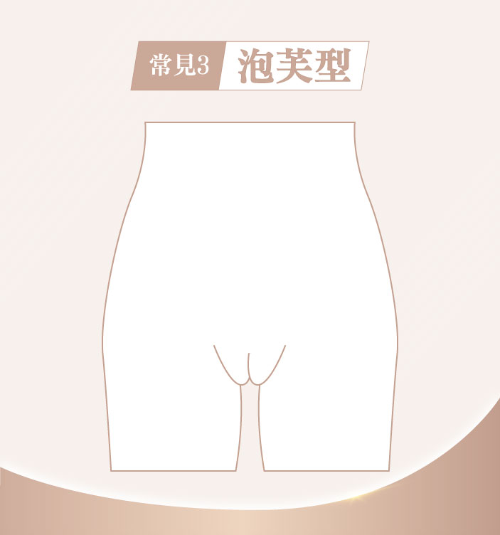 泡芙型與芭比型相似,大陰唇可以包覆小陰唇,不過整體外觀會再豐滿突出一些,像是可愛的小泡芙。此類型通常不會有不適感,但部分人會希望外陰部輪廓看起來更平順。